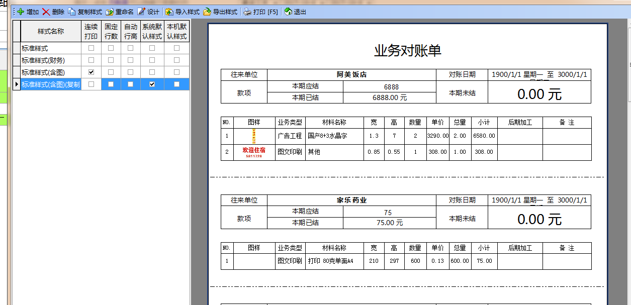 飛揚動力廣告公司管理軟件在與客戶進行對賬的時候,可以根據客戶自己的要求,將對應的對賬信息直接導出excel或是直接打印出來發給客戶進行對賬。在對賬中,可以將客戶所有的開單信息和圖片縮略圖都直接導出,方便客戶對賬和查詢。