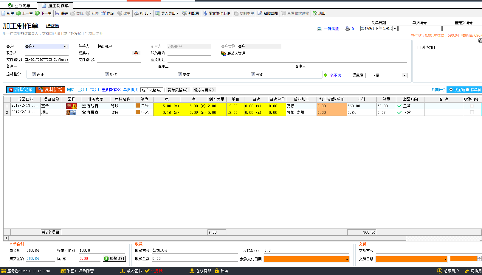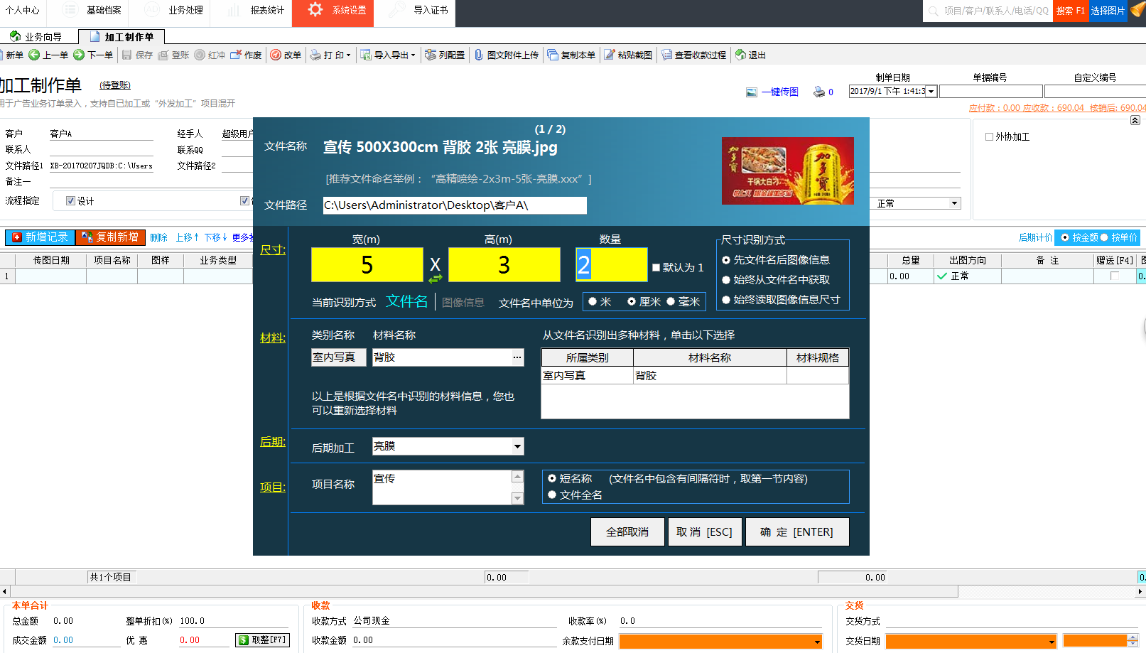 為廣告公司的業(yè)務(wù)員提供了快速開單的功能,拖動圖片到軟件,軟件可以自動識別圖片中的信息,包含項目名稱(制作內(nèi)容)、材料名稱、寬、高、制作數(shù)量以及后期加工等信息,材料單價此前已經(jīng)綁定,自動顯示,所以整張單據(jù)都不需要再手動去填寫相關(guān)的業(yè)務(wù)信息,廣告公司管理軟件就已經(jīng)自動開好單據(jù)。保存登賬計入財務(wù)。