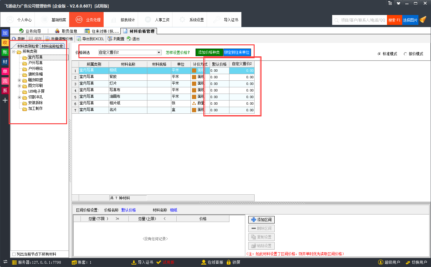 飛揚動力廣告公司管理軟件可以針對不同的客戶設置不同的價格,比如,針對臨時客戶設置一套獨立的價格,只需要到材料價格管理中,添加一個臨時客戶的分類。然后,填寫對應的臨時客戶的材料價格就可以了。