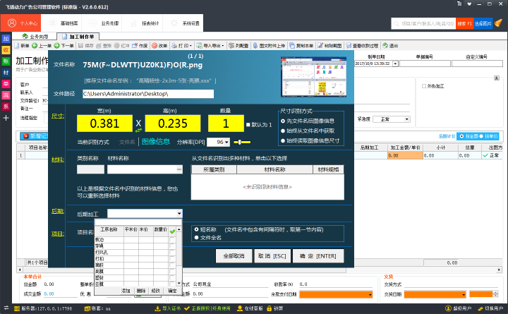 飛揚動力廣告公司管理軟件在開單的時候,可以將選擇后期加工的工序,同時可以添加后期加工的單價!這樣后期加工就能顯示在加工制作單里面: