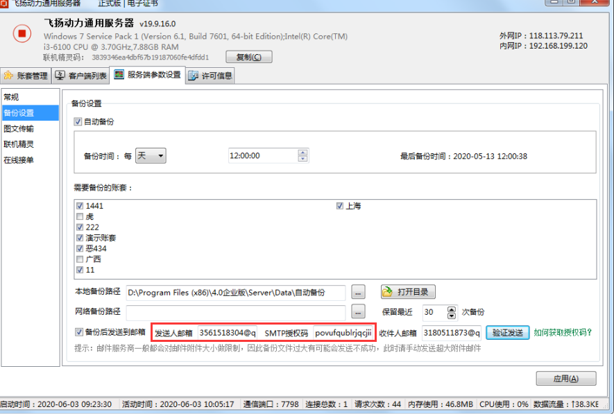 為了避免客戶因硬盤損壞或者重裝系統,格式化所有磁盤,造成主機電腦所有數據丟失的情況,飛揚動力廣告公司管理軟件新增郵箱備份功能。客戶可以設置好郵件備份,軟件每天都把備份數據發送到你們自己的郵箱,即使主機電腦造成不可恢復的數據丟失,也可以通過郵箱備份的數據進行恢復,讓數據安全更有保障。那么如何將賬套數據備份到郵箱呢?具體操作步驟如下: