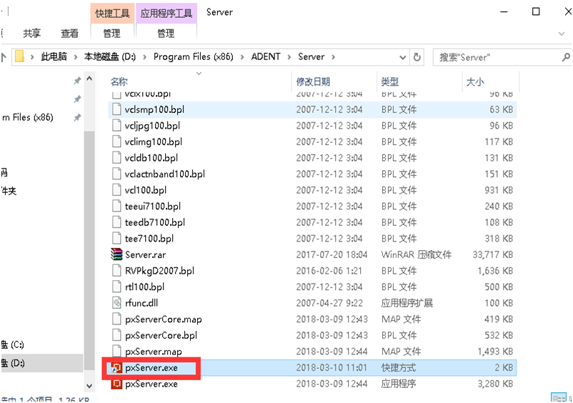 在路徑為D:\Program Files(x86)\ADSTART\Server的文件夾下,找到pxServer.exe這個文件,同樣也創建一個快捷方式,并放到系統桌面,如下圖所示: