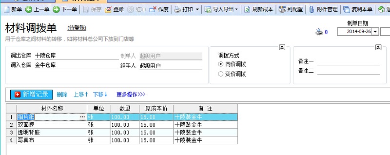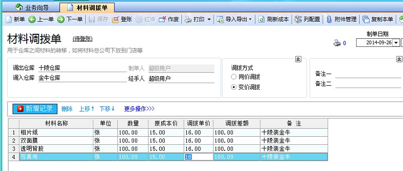 第三、在材料調撥單明細中,選擇需要調撥的材料名稱,填寫調撥數量,原成本價,如果是變價調撥還需要填寫調撥單價,備注等信息。
