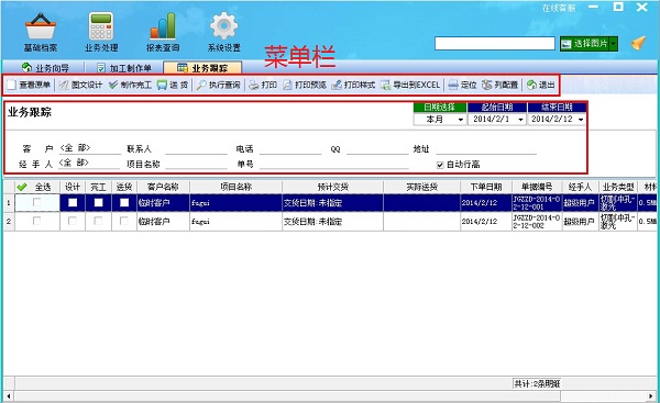 在業務跟蹤的菜單欄中主要有一下幾項功能:1.查看原單;2.圖文設計;3.制作完工;4.送貨;5.執行查詢;6.打印;7.打印預覽;8.打印設置;9.導出到Excel;10.定位;11.列配置;12.退出;