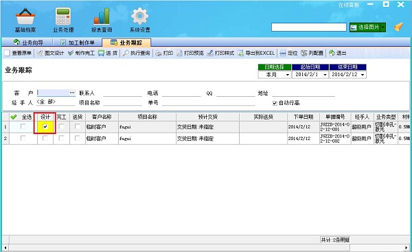 如果訂單只是開好,但是還沒有進行設計,那么就讓設計部門的設計人員把訂單中的項目設計完成,完成后就在業務跟蹤菜單欄點擊“圖文設計”,填寫好信息后點擊確定,在業務跟蹤界面列表信息中的“設計”一欄就會顯示為黃色背景并勾選,如圖2所示